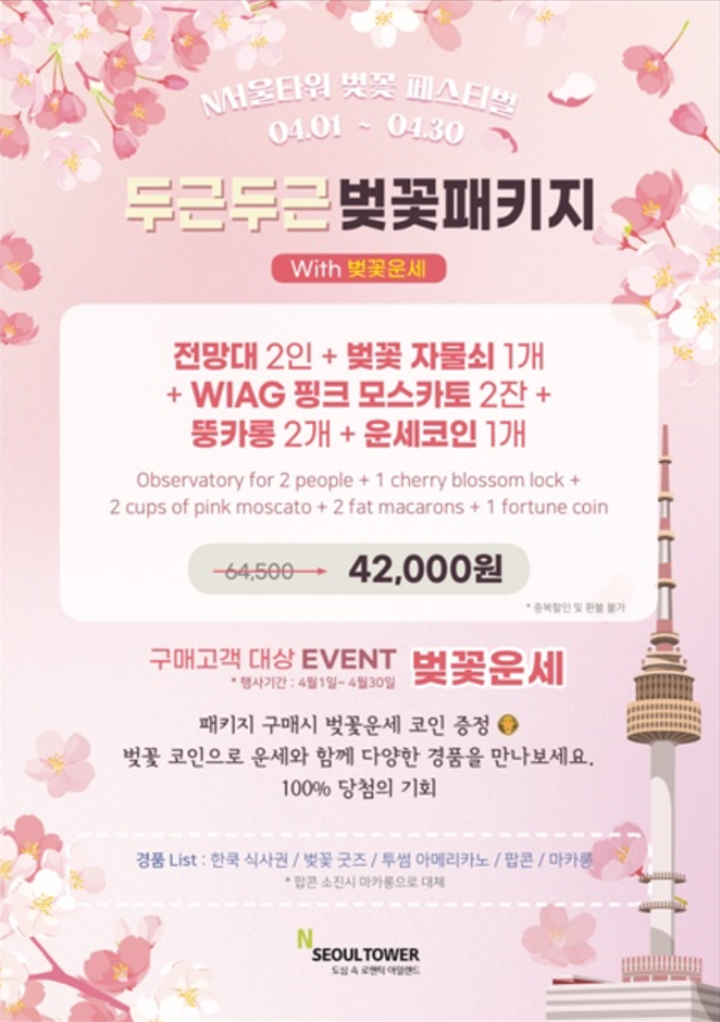 전망대 2인+벚꽃 자물쇠 1개+핑크 모스카토 2잔+뚱카롱 1개+운세코인 1개